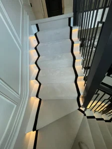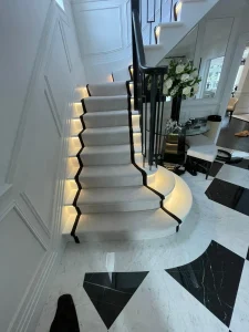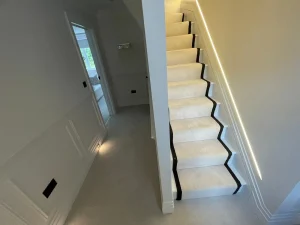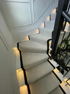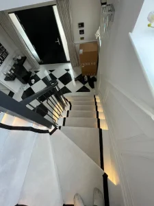 We were once again delighted to partner with one of our trusted high-end interior designers on a recent project. The designer selected the products for this luxurious space, but as with every project, we took the time to review the site in detail. During this process, we identified several potential challenges, including issues with sub-floor preparation, the selected laying style, and the complexities of both carpet and Karndean flooring installation. With our longstanding partnership, we were able to anticipate and address these challenges before they could impact the overall installation, ensuring the best possible outcome for the end user.
